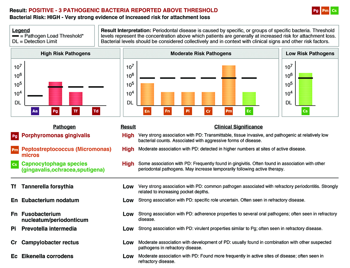 Research has recognized that there is a difference in biofilm between healthy implant sites and areas affected by peri-implantitis.7 Subgingivally, the biofilm in patients with peri-implantitis has exhibited more bacteria from the orange complex, which are known to cause periodontitis. Some of these pathogens can be identified via salivary diagnostics. Typically, patients with periodontitis are more prone to developing bone loss around dental implants. This may be due to the type of bacteria in the biofilm. The frequency of Porphyromonas gingivalis and Aggregatibacter actinomycetemcomitans, which are classified as aggressive pathogens, was found to be similar between cases of periodontitis and peri-implantitis.8 Various laboratories provide salivary diagnostics, including testing for pathogenic bacteria such as P gingivalis and A actinomycetemcomitans (Figure 3).